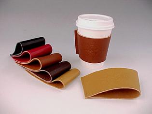 Full grain leather sleeve for insulating most disposable hot drink cups. Flattens to carry in pocket, briefcase, purse, or car.